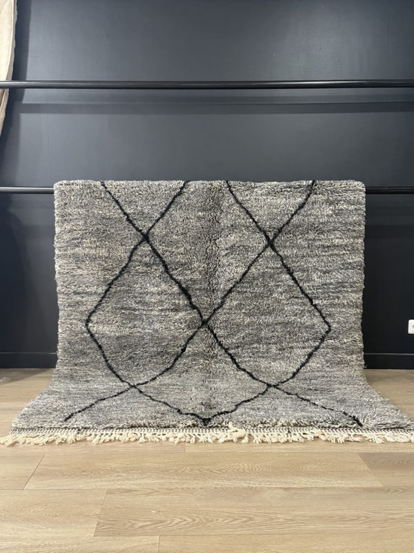 Ce tapis gris complète harmonieusement un intérieur sobre tout en racontant une histoire de tradition, de patience et d’élégance berbère.